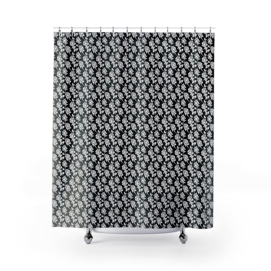 Black W/ White Floral Rose Polyester Shower Curtain