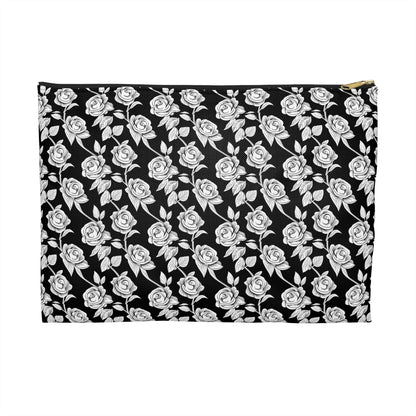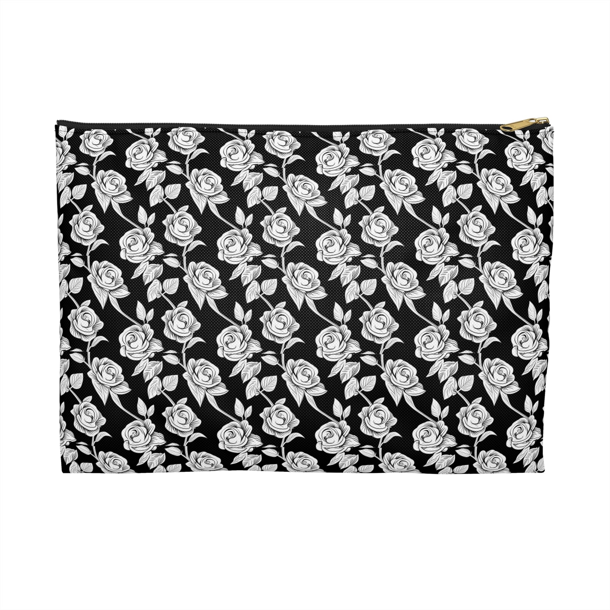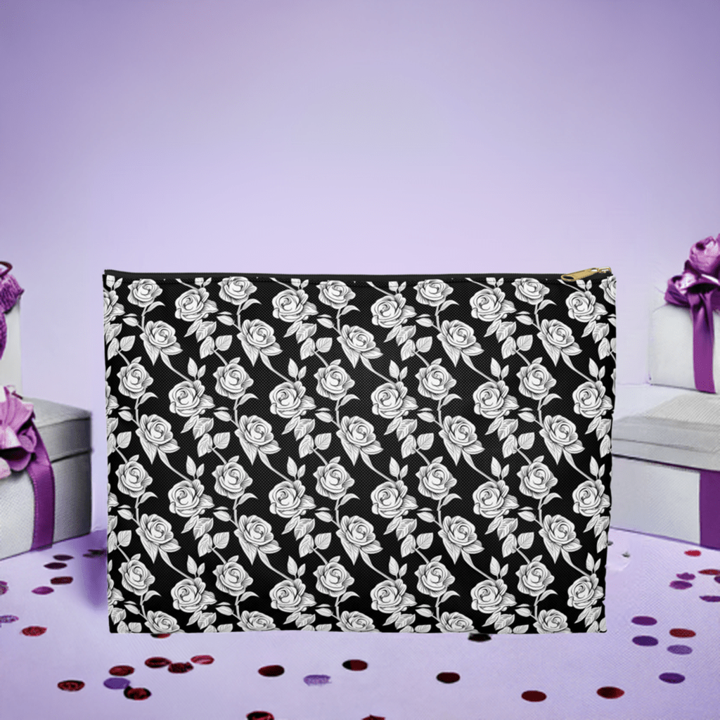 Elevate your travel game with our Black with White Rose Pattern Cosmetic Travel Bag—a sophisticated touch of luxury for the modern traveler. Crafted from 100% spun polyester, this bag retains its shape and stays wrinkle-free, so no ironing is ever needed. The elegant white rose pattern adds a chic contrast to the sleek black design, while the durable zipper closure with a gold puller brings a hint of glamour. Inside, the non-woven black laminate lining ensures your essentials stay protected and organized. Easy to clean and effortlessly stylish, this is the ultimate travel companion!
