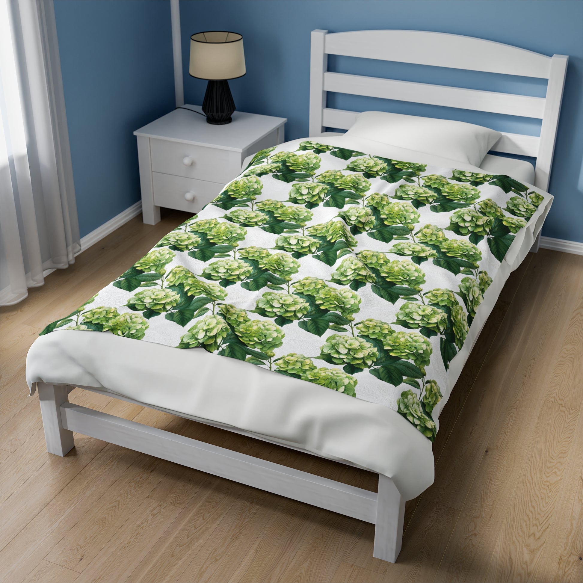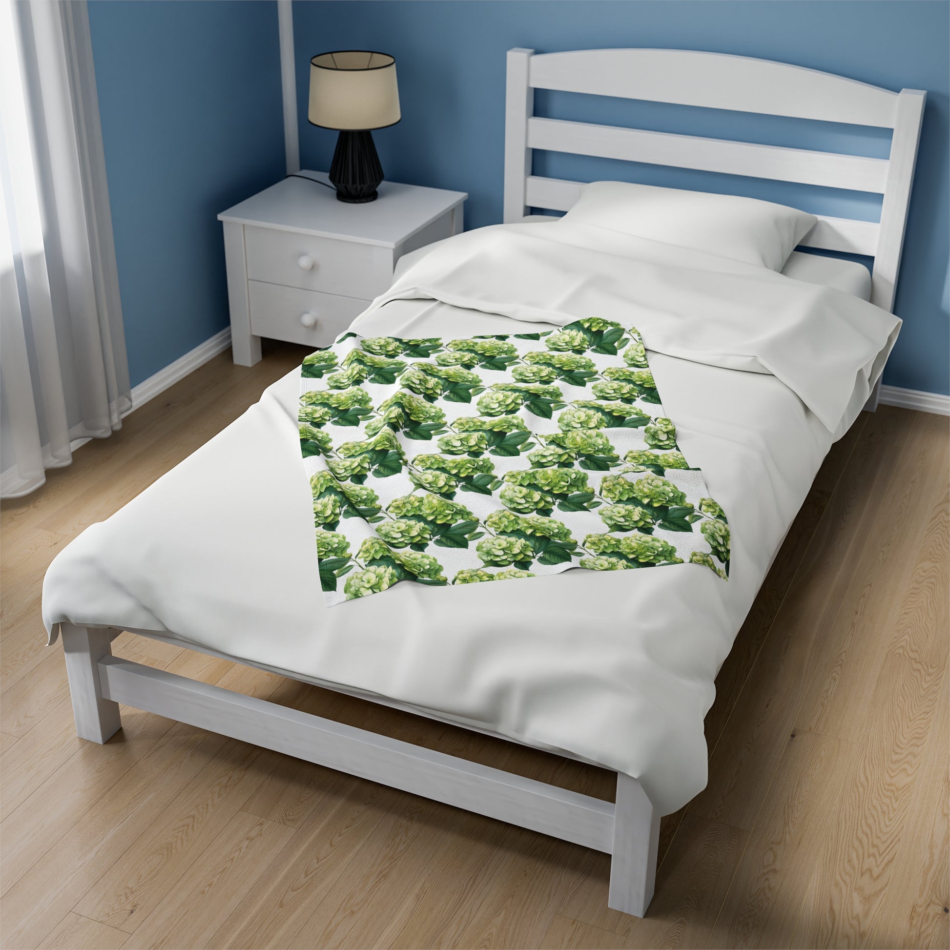 Green Hydrangea on White Velveteen Plush Blanket